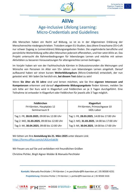 Aufbauend auf Diskussionsrunden im Frühjahr des Vorjahres, in denen das IARA-Projektteam der Fachhochschule Kärnten die Meinungen und Wünsche von älteren Personen zum Thema „Lebenslanges Lernen“ eingeholt hat, wurde im Rahmen von AliVe nun ein kompakter Weiterbildungskurs (Micro-Credential) entwickelt, der nun zur Verfügung steht und getestet wird.