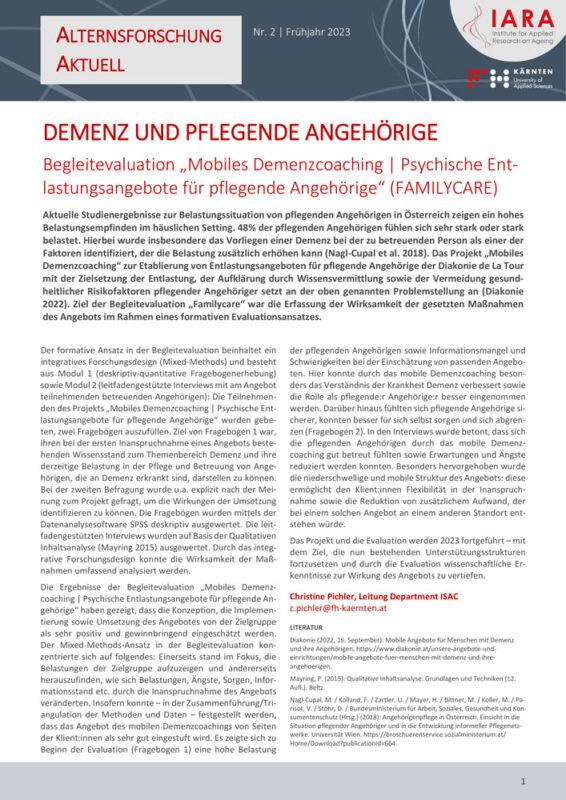 - Demenz und pflegende Angehörige – Begleitevaluation „Mobiles Demenzcoaching | Psychische Entlastungsangebote für pflegende Angehörige“ (FAMILYCARE)