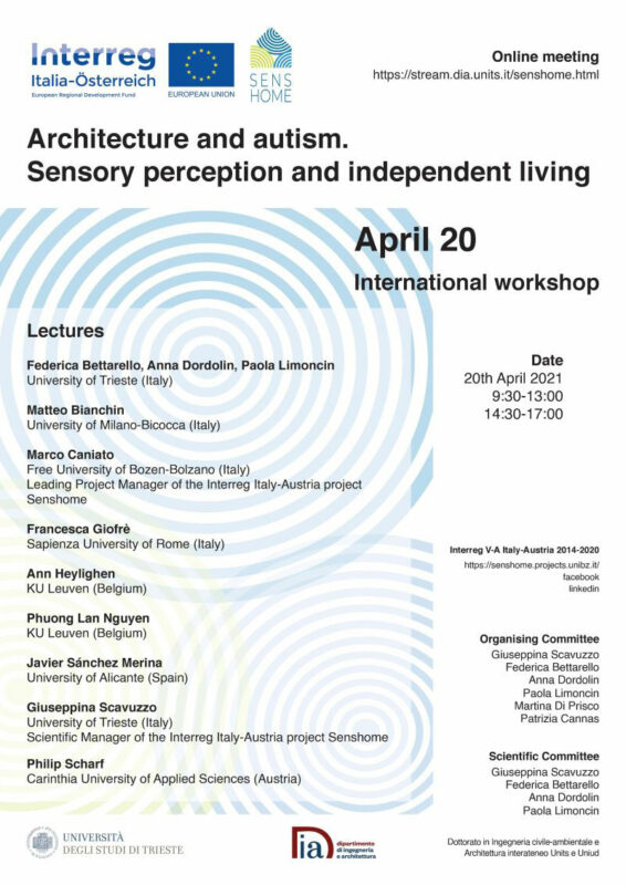 Die Präsentation der FH Kärnten steht Ihnen als Download zur Verfügung – siehe grüner Button unten.Die Universität Triest (UNITS) führt im Rahmen des Projektes SensHome Sensing Special Needs einen internationalen Workshop zum Thema „Architecture and Autism. Sensory perception and independent living“ durch. Das Online-Event wird per Livestream übertragen.