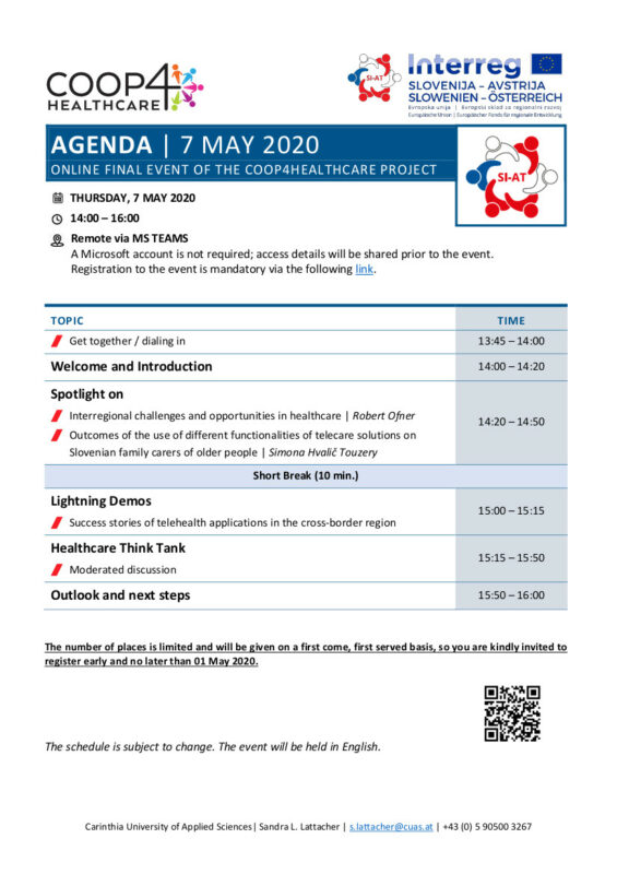 Event-Dokumentation nun online!Die Präsentationen und weitere Informationen, insbesondere zum aktiven Healthcare-Think-Tank der Region Österreich-Slowenien, finden Sie auf der Website der Forschungsgruppe AAL der Fachhochschule Kärnten unter folgendem Link: https://forschung.fh-kaernten.at/aal/en/follow-up-coop4healthcare-online-final-event/. |