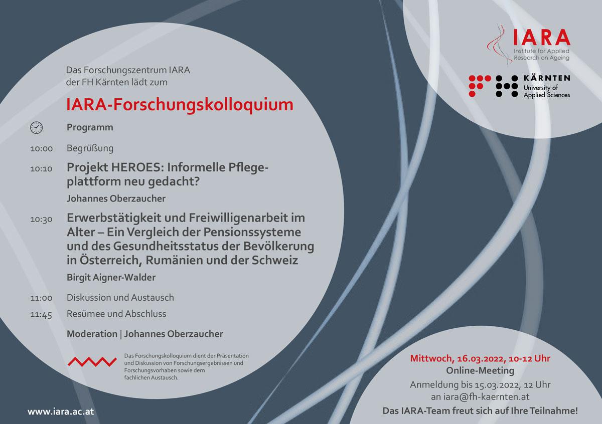 On Wed, March 16, 2022, the Institute for Applied Research on Ageing IARA at Carinthia University of Applied Sciences dedicated its online research colloquium to the introduction into the HEROES project and a country comparison on employment, volunteering and health in old age in Austria, Romania and Switzerland.
