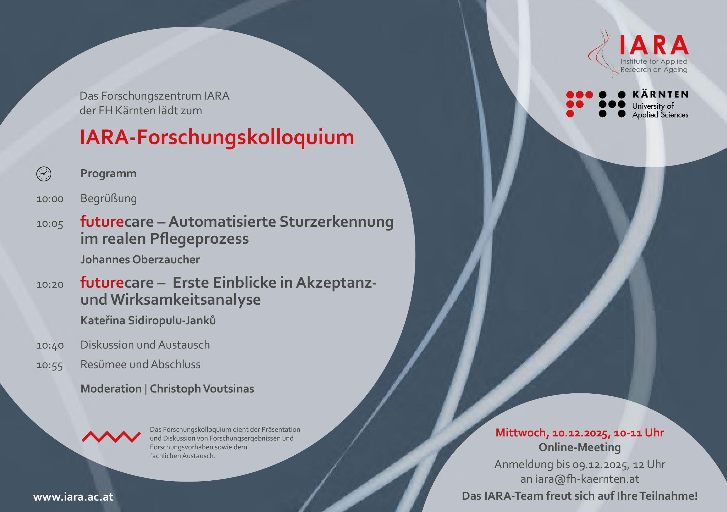 Das Alternsforschungszentrum IARA der FH Kärnten lädt Sie ein, das Projekt Future Care kennenzulernen, im Rahmen dessen wir gemeinsam mit der Caritas Kärnten ein intelligentes Sturzerkennungssystem mittels KI-gestützten Deckenlampen im Pflegealltag im Haus Martha in Klagenfurt testen. Ziel ist es zu evaluieren, wie sich das System in der Praxis bewährt und ob sowohl das Personal entlastet als auch die Sicherheit der Bewohner*innen erhöht werden kann. Im Forschungskolloquium berichten wir über das laufende Projekt und erste Erfahrungen aus dem Testeinsatz.