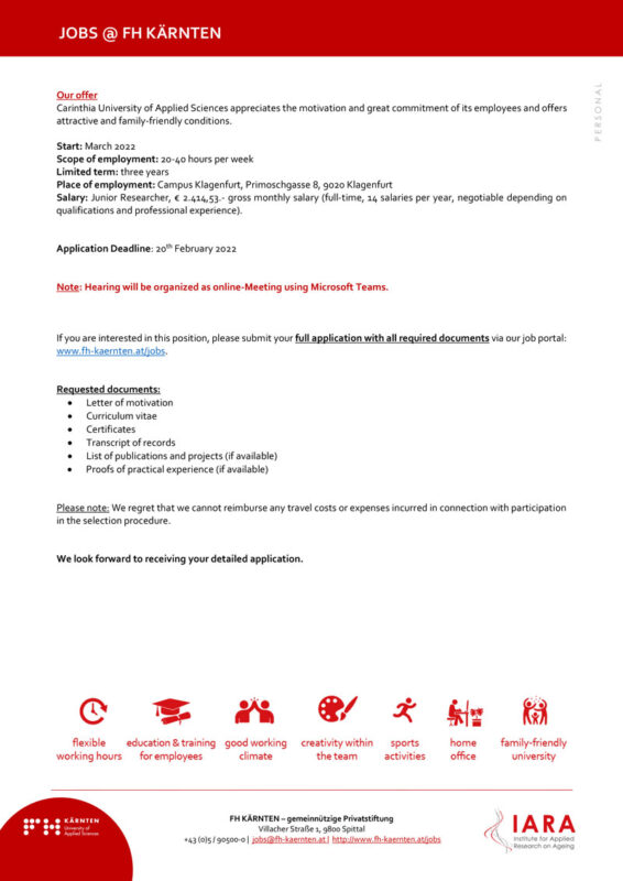 Die Fachhochschule Kärnten besetzt am Institute for Applied Research on Ageing (IARA) am Department for Health and Assistive Technologies (HAT) folgende Position: