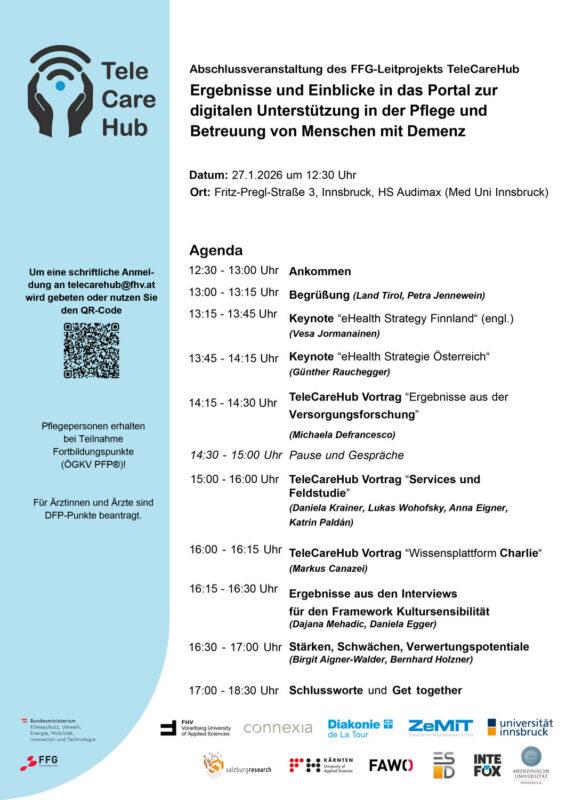 Im Rahmen der TeleCareHub-Abschlussveranstaltung am 27.01.2026 in Innsbruck erhalten Sie umfassende Einblicke in die Ergebnisse der TeleCareHub-Testphase. Es erwarten Sie mehrere interessante Vorträge, die verschiedene Aspekte des Projektes rund um eHealth und Telepflege – und betreuung genauer beleuchten.
