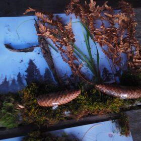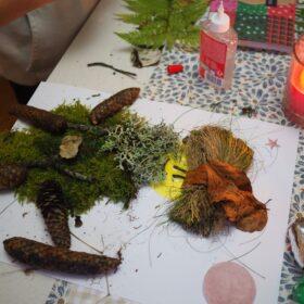 „Wir möchten den Kindern vor allem eine stimmungsvolle Zeit abseits des Alltags und Trubels schenken“, so Christine Pichler vom IARA. Am Feuer, das vor dem Haus flackerte, nahm sie die Kinder mit auf eine Reise durch das Leben des hl. Nikolaus. Die Geschichten waren der Anstoß für die nächste Aktivität – in Kleingruppen suchten wir im Wald, oft querfeldein, nach Naturmaterialien, um uns dann mit vollgefüllten Taschen an Blättern, Moos, Flechten u.ä. wieder in der Hütte zu versammeln.