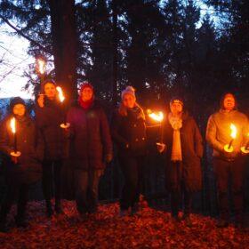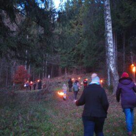 Inzwischen war es dunkel geworden – für eine kleine Fackelwanderung waren alle rasch zu begeistern. Aber es gab noch eine Überraschung – am Weg waren Bilder aus dem Leben des hl. Nikolaus versteckt. Einmal gefunden fügten sie die Kinder wieder zu seiner Lebensgeschichte zusammen – und siehe da, in der Hütte wartete ein großer Nikolaussack, wo für jede und jeden ein kleines Päckchen zu finden war. Mit Tee und Keksen ließen wir den Tag ausklingen. Vor Aufbruch nützten einige auch noch die Zeit, um vor der Hütte (Hexe) zu spielen und herumzutollen.